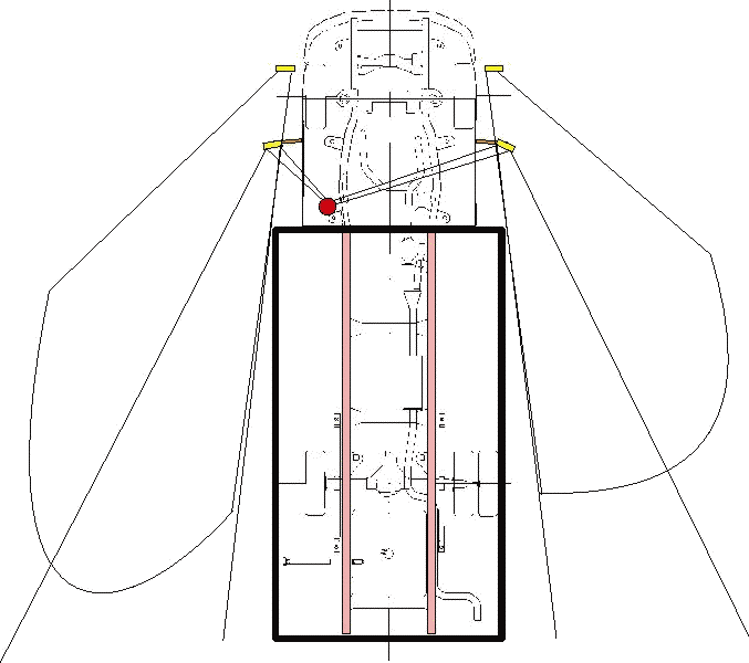Look Around - Low Tech We made the decision to duplicate the basic viewing configuration of the Version 1 school bus. The goal was to have large, flat side-view mirrors mounted on the doors and convex, "blind spot" or "lane change" mirrors mounted as far forward as possible on the fenders. These are in addition to the side-view and rear-view camera systems. Since most commercial trucks are utilitarian vehicles built on a tight budget, typical mirror configurations were limited. Hours spent on interstate highways demonstrated a wide variety of mirrors on larger trucks. A bit of "Googling" located a manufacturer, Velvac, that made a full line of mirrors for everything from RVs to OTR trucks. We selected a "20 20" style mirror. These are available in combinations that include both flat and convex/wide angle units mounted on the cab door. We chose the Standard model, which comes with a stick on convex mirror we will not use. These units are heated and offer the same remote/internal positioning features found on most automobiles. For wide angle viewing of the "blind spots" for lane changing, we chose a separate mirror, mounted forward on the fenders. Velvac had three basic styles, two of which might work. As it turned out, the front fender of the GMC cab have a double wall that allows convenient mounting of mirrors in the very front of the fenders. We chose the "Mod Pod" mirrors, offering the cleanest appearance. The drawing below shows the visibility pattern from the mirrors.